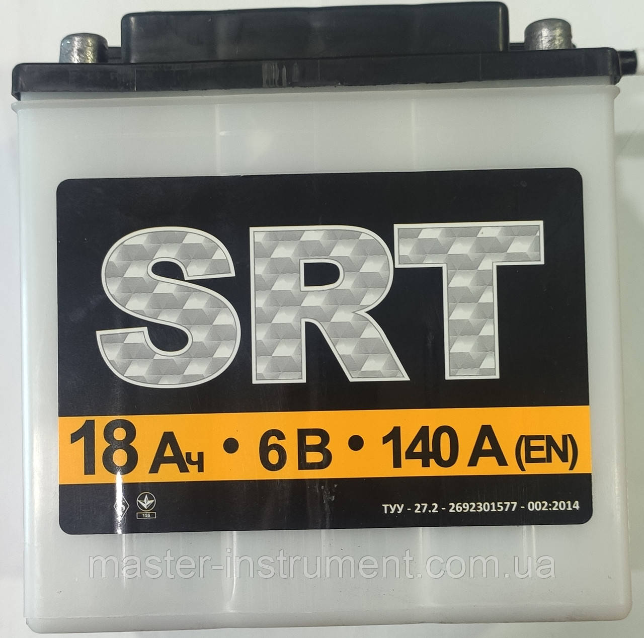 Мото акумулятор SRT 3мтс 18 С - компактний акумулятор для мотоцикла, має вольтаж 6 Вольт, при цьому ємність його 18 Ач, а пусковий струм досягає 140 Ампер. Виходи в даній моделі - це дві круглі клеми для підключення до мототехніки.